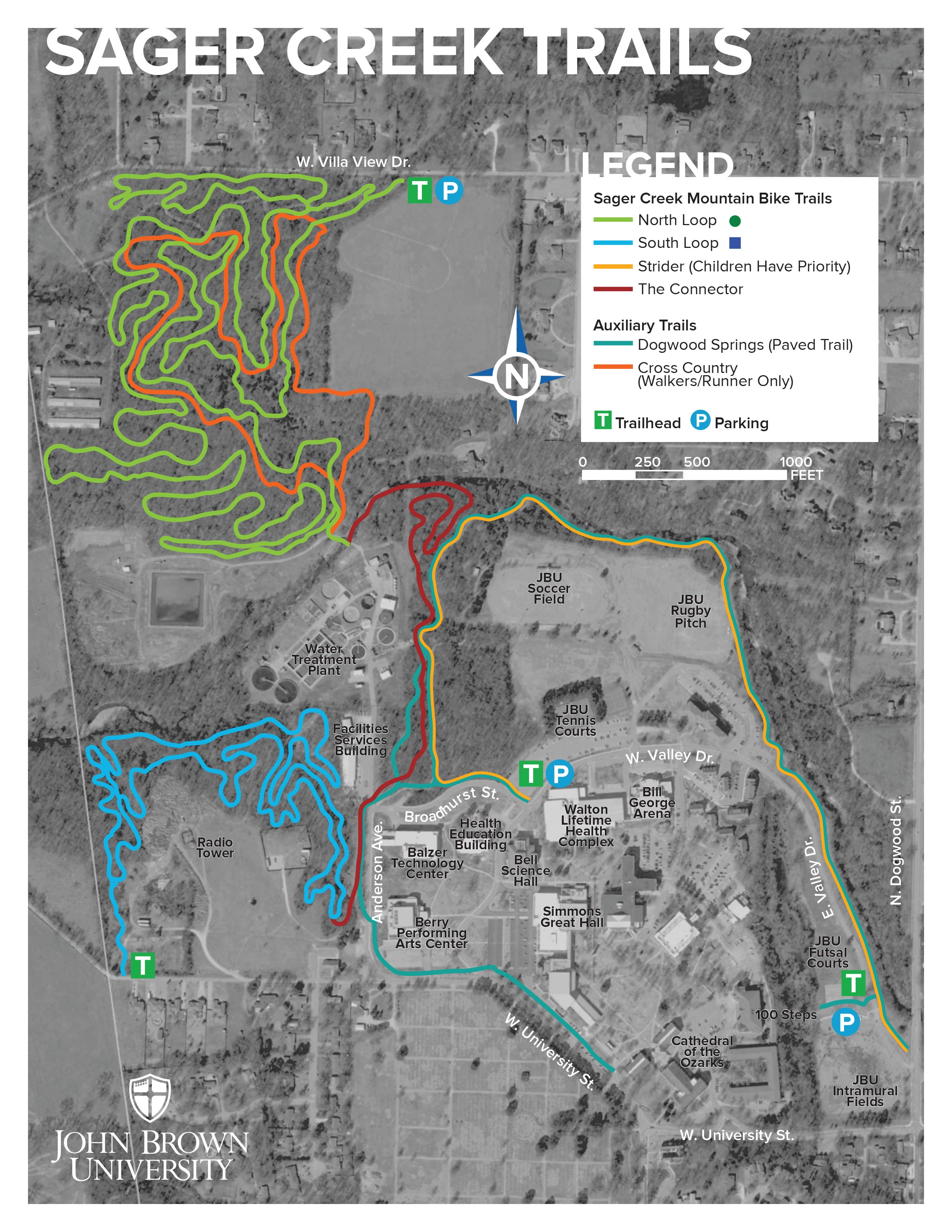 The main entry to the Sager Creek Mountain Bike Trail is located on W. Valley Drive near the JBU tennis courts on the north side of campus.