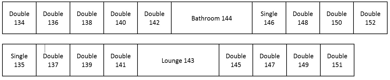 Each room in Mayfield is furnished with two beds, two desks and chairs, two dressers, two wardrobes and a sink. The rooms are joined by a spacious lobby looking out toward the courtyard which has outdoor seating and a fire pit.