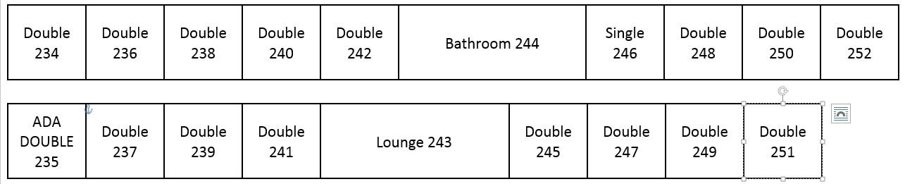 Mayfield Hall is an all-women two-story housing facility built in a U-shape that houses up to 250 students. The three wings have been affectionately dubbed Old, Middle and New and so students refer to their halls as being "up-old," "down-new," etc.  Each hall contains approximately 20 rooms with one large centrally located bathroom. All the rooms, 119 in total, with the exception of nine single rooms, are double occupancy.